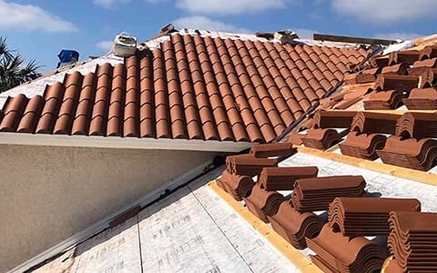 We inspect the base sheathing, replacing any stained or rotted wood before applying new underlayment, battens, and tiles.