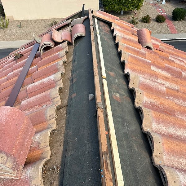 Ridge PreparationWe carefully remove the ridge tile to inspect and replace any components before reinstalling.